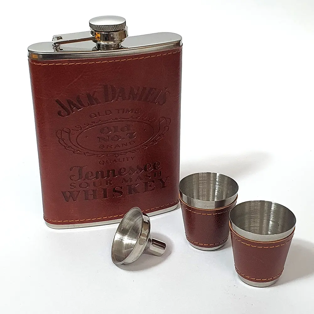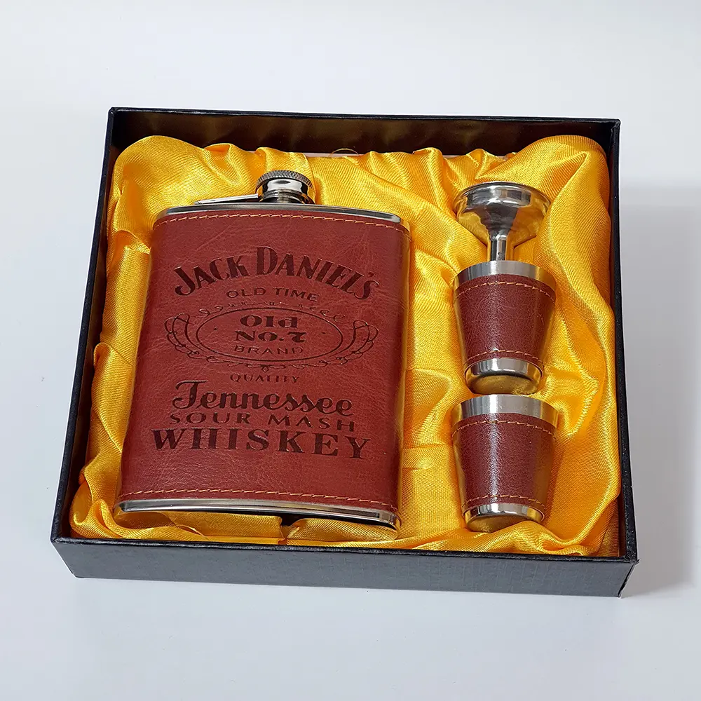 Стильный мужской подарочный набор Jack Daniel’s: металлическая фляга в кожаном оформлении, две рюмки и воронка в эффектной подарочной коробке. Отличный подарок для близких, друзей, коллег и ценителей качественных аксессуаров.
