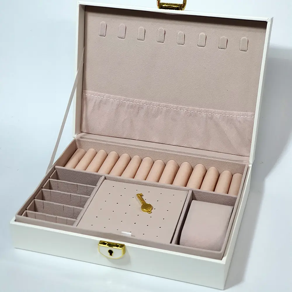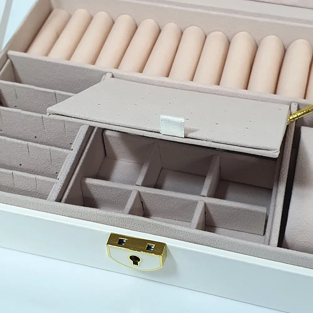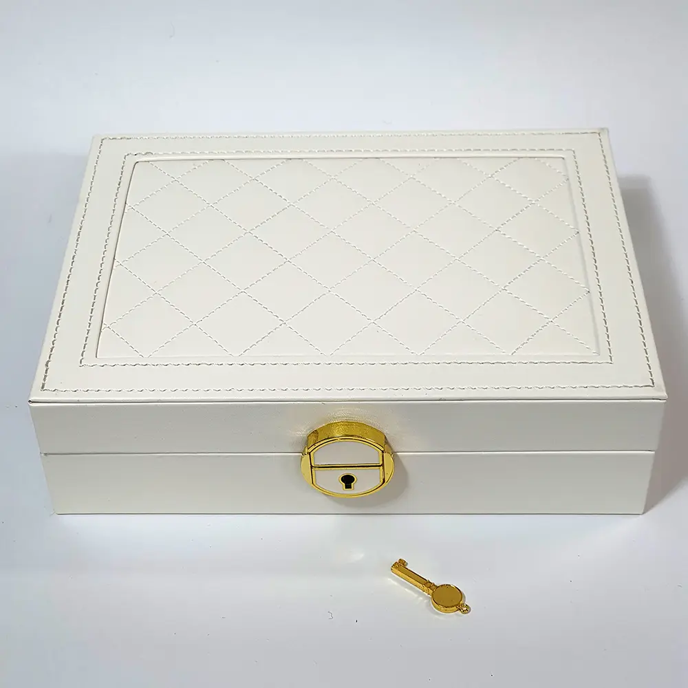 Элегантная белая шкатулка для украшений с обивкой под кожу и мягкой внутренней отделкой. Закрывается на ключ. Идеальный вариант для хранения украшений и стильный подарок.
